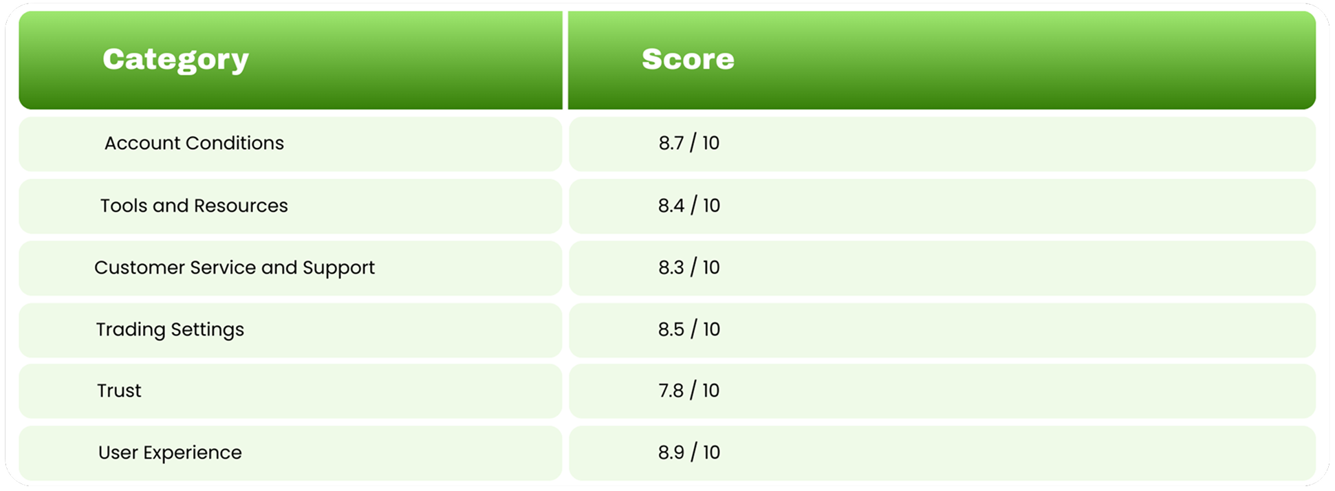 Ratings are based on six weighted categories: transparency of costs, quality of tools and resources, support responsiveness, trading conditions, trust signals and policies, and overall usability. Greater weight is given to factors that directly affect real trading outcomes, such as execution reliability, clarity of fees, and ease of risk management.